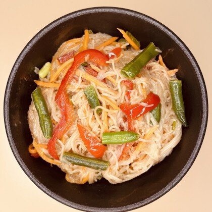 Лапша соба, морковь, стручковая фасоль, болгарский перец, соевый соус, кунжут.