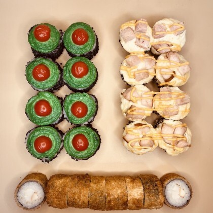 Грибной Чикен (Грибы шиитаке, курица х/к, сливочный сыр, чесночный соус, рис, нори), Ролл (Кальмар, сливочный сыр, огурец, чесночный соус, сырная шапка, соус танец креветок, спайси соус, рис, нори) Маки темпура тунец (Тунец, рис, нори, кляр, панировочные сухари)