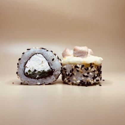 Грибы шиитаке, курица х/к, сливочный сыр, чесночный соус, рис, нори.